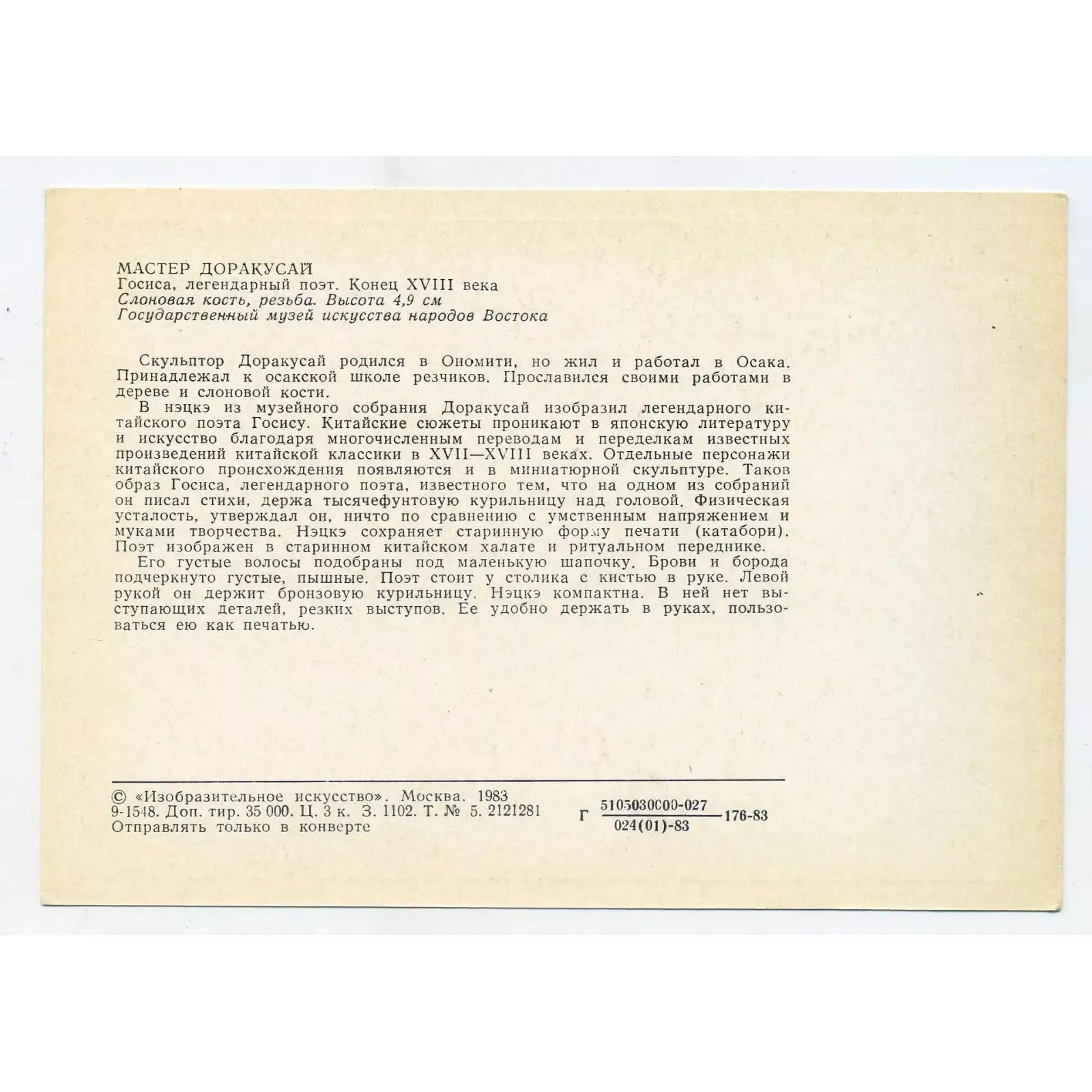 Our Dorakusai Gosisa netsuke postcard, published in 1983 by the Fine Arts Publishing House in Moscow, vividly depicts an ivory carving. Standing at 4.9 cm tall, this netsuke was created by Master Dorakusai of the prestigious Osaka school. Moreover, it exemplifies the strong influence of Chinese literary subjects on Japanese art.