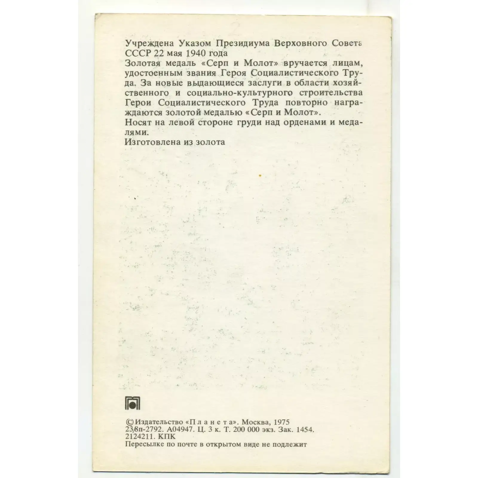 The back of the postcard reads: “Established by Decree of the Presidium of the Supreme Soviet of the USSR on 22 May 1940. The gold medal ‘Sickle and Hammer’ is awarded to those honored with the title Hero of Socialist Labour. This medal recognizes outstanding services in economic and socio-cultural construction. Heroes of Socialist Labour may receive the gold medal ‘Sickle and Hammer’ multiple times. Wear it on the left side of the chest above other orders and medals. Made of gold.”