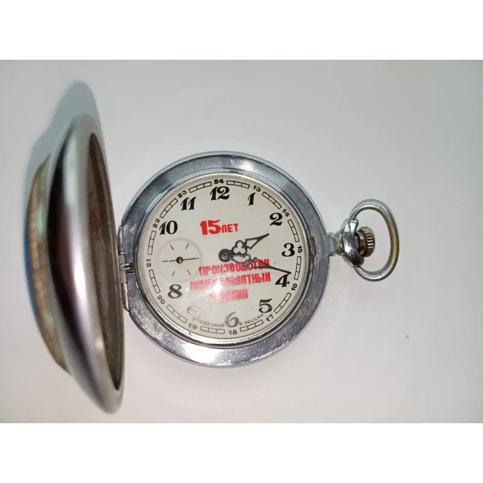 This Molnija pocket watch “TCM 15” is being sold as-is and does not come with papers or original packaging. It has a full hunter closure and a silver coloured case and dial. The watch is in pre-owned condition.