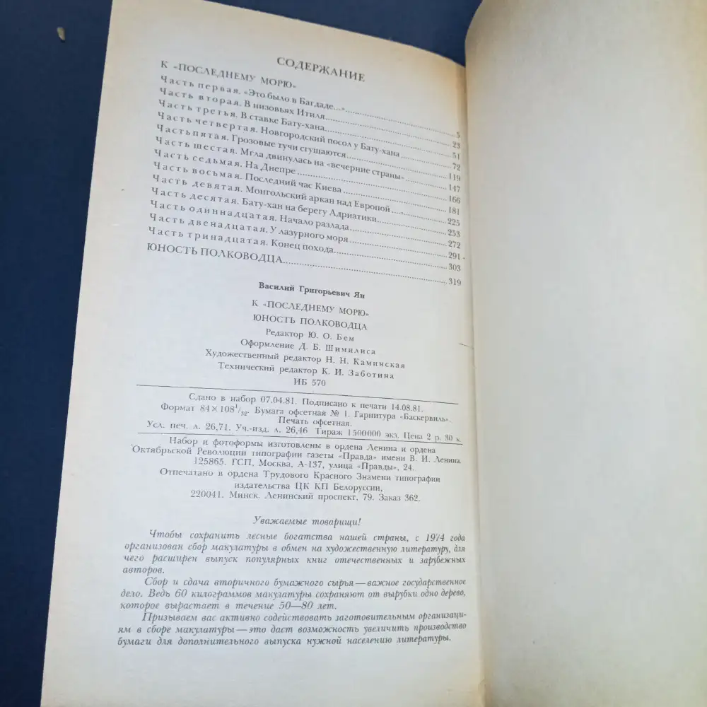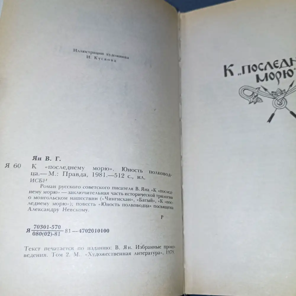 Роман русского советского писателя В. Яна “К последнему морю” – заключительная часть исторической трилогии о монгольском нашествии (“Чингизхан”, “Батый”, “К последнему морю”). Повесть “Юность полководца” посвящена Александру Невскому.