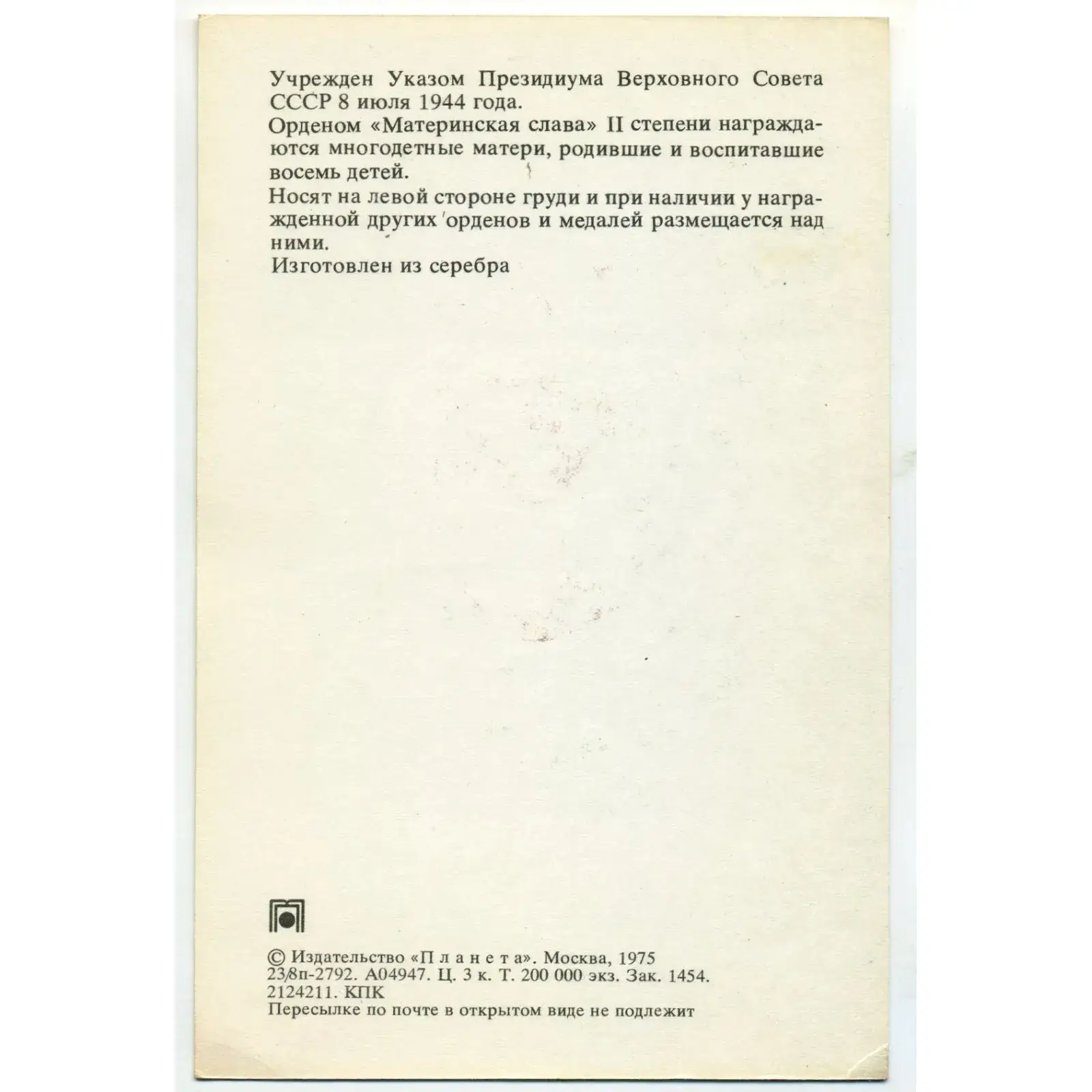 The back of the postcard reads: “Established by Decree of the Presidium of the Supreme Soviet of the USSR on 8 July 1944. The Order of ‘Maternal Glory’ 2nd Degree is awarded to mothers who gave birth to and raised nine children. Wear it on the left side of the chest. If the awardee has other orders and medals, place this one above them. Made of silver and non-ferrous metal.”