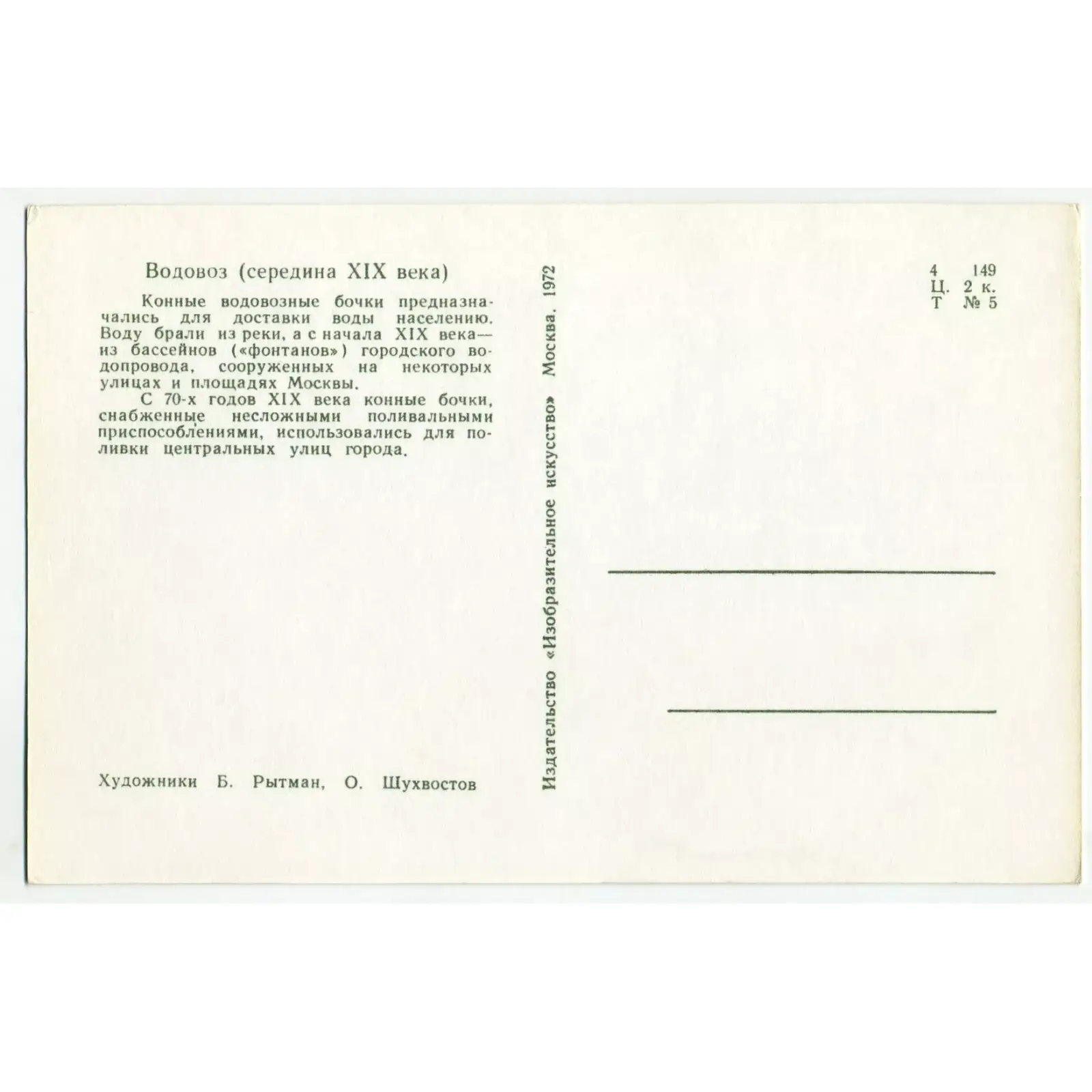 This vintage Moscow postcard depicts a water carriage, an essential element in the city’s mid-19th century transportation history. Measuring 5 5/8″ x 3 9/16″ (14.3 x 9.1 cm), this collectible was published by the Publishing House “Fine Arts” in Moscow in 1972.