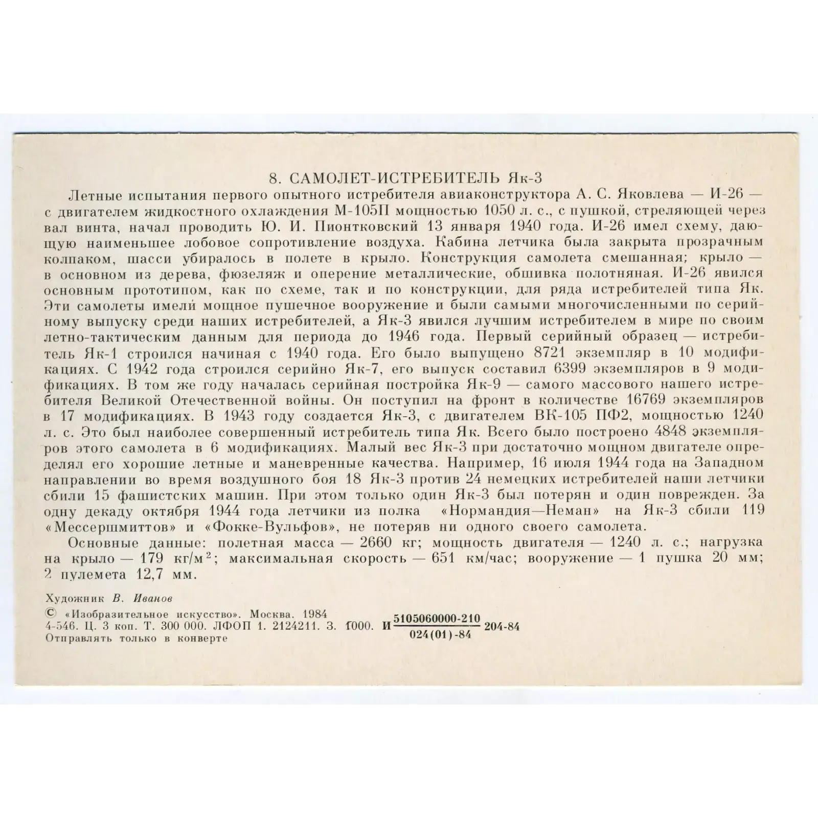 Vintage PostCard Soviet combat aircraft FIGHTER AIRCRAFT Yak-3